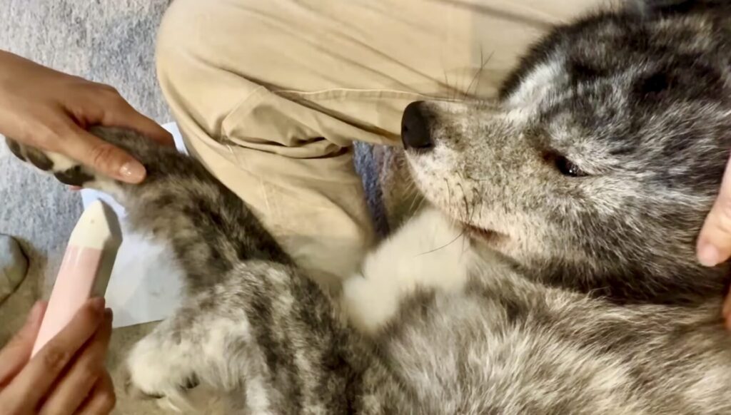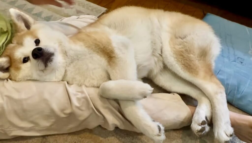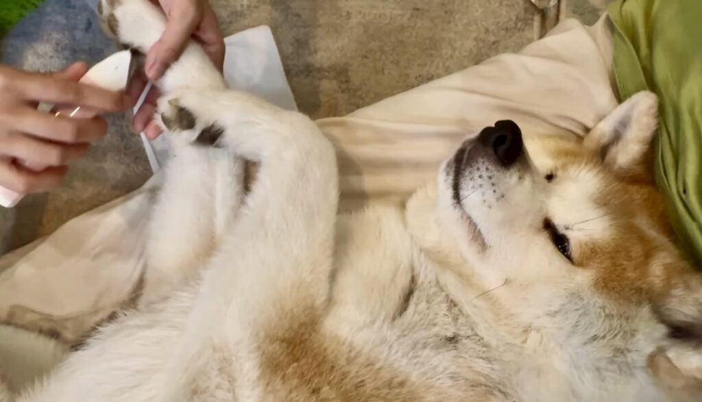足裏のお手入れで、一人だけVIP対応のオイルケアまでしてもらい夢見心地な秋田犬こむぎ