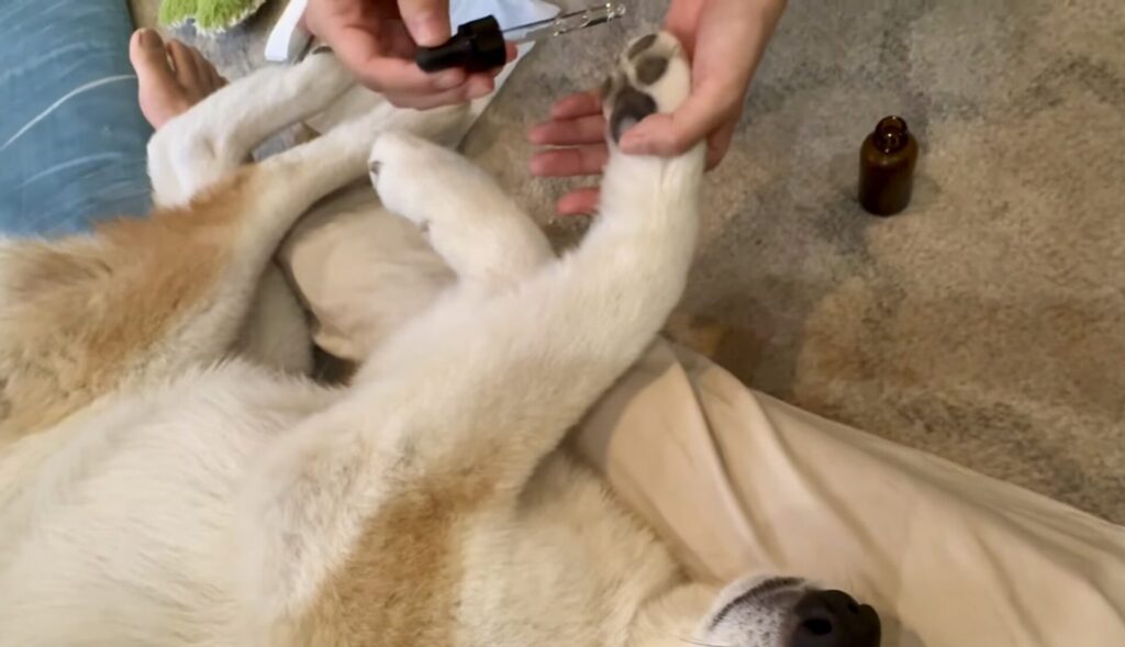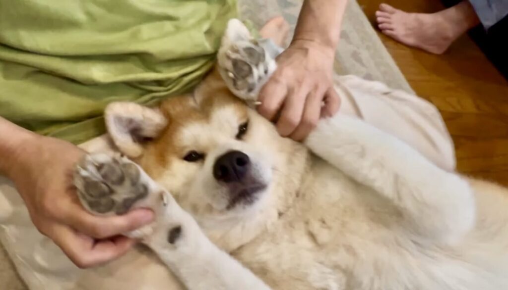 秋田犬ぱたこむ劇場(44)足裏のお手入れで、一人だけVIP対応のオイルケアまでしてもらい夢見心地な秋田犬こむぎ